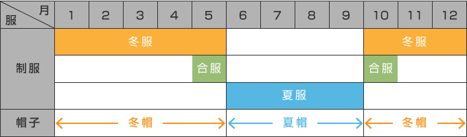 - 夏服は「白の半袖開襟シャツと紺の半ズボン」、合服は「白の長袖シャツと紺の半ズボン」、冬服は「紺の学生服と紺の半ズボンまたは紺の長ズボン」とする。
